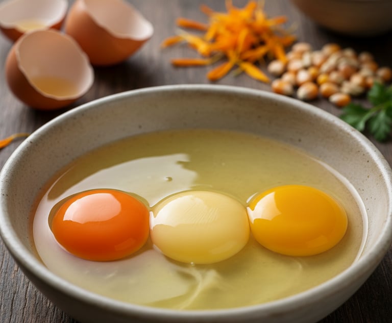 Carotenoids: The deep colour comes from Carotenoids, which are powerful antioxidants found in the green grasses, corn, and seeds that free-range hens consume. These are vital for eye health.